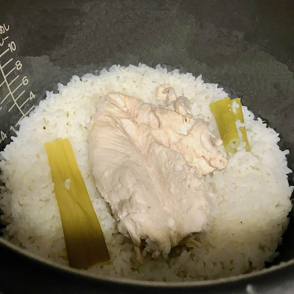 ニンニク、ショウガを入れてよく混ぜ、ネギ(青い部分)と鶏肉を皮目を下にして入れ、普通に炊く。