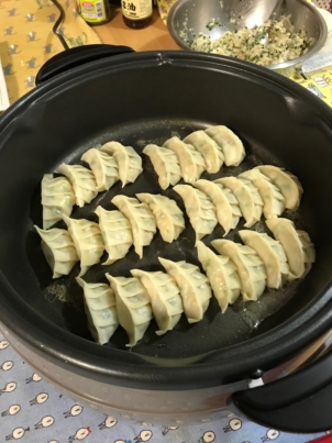 8.今回はホットプレートで焼きました。ゴマ油を大さじ1ほど引いて餃子を並べます。小麦粉小さじ半分ほどを溶いた水100cc入れて蓋をします。水分が飛んで、いい感じの焼き色がついたらいただきます。
