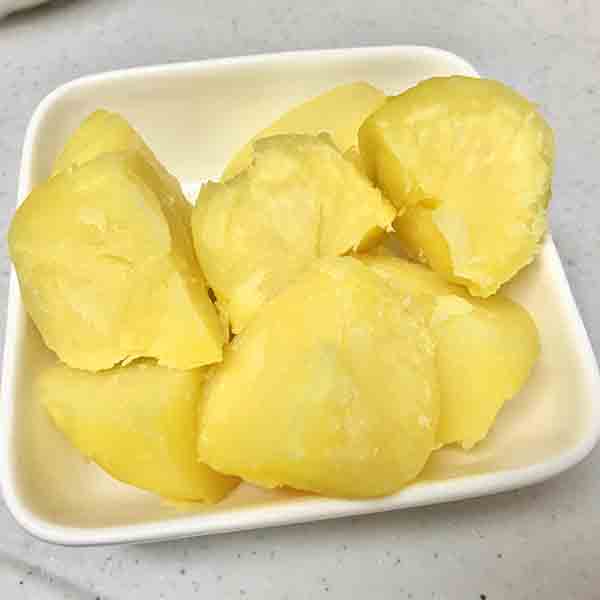 熱いうちにキッチンペーパーで包みながら皮をむき、一口大に切っておきます。