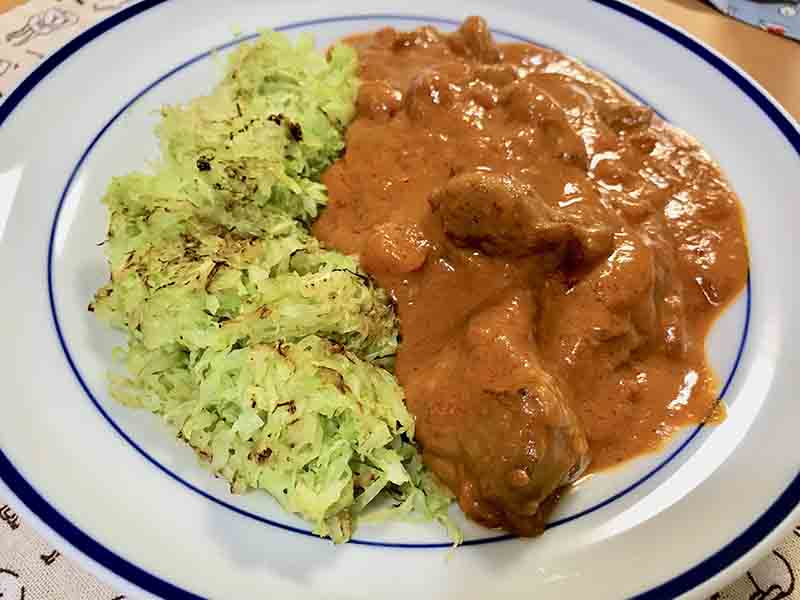 糖質制限中のとーちゃんはご飯の代わりにキャベツの千切りを炒めたものにカレーをかけて食べてます。